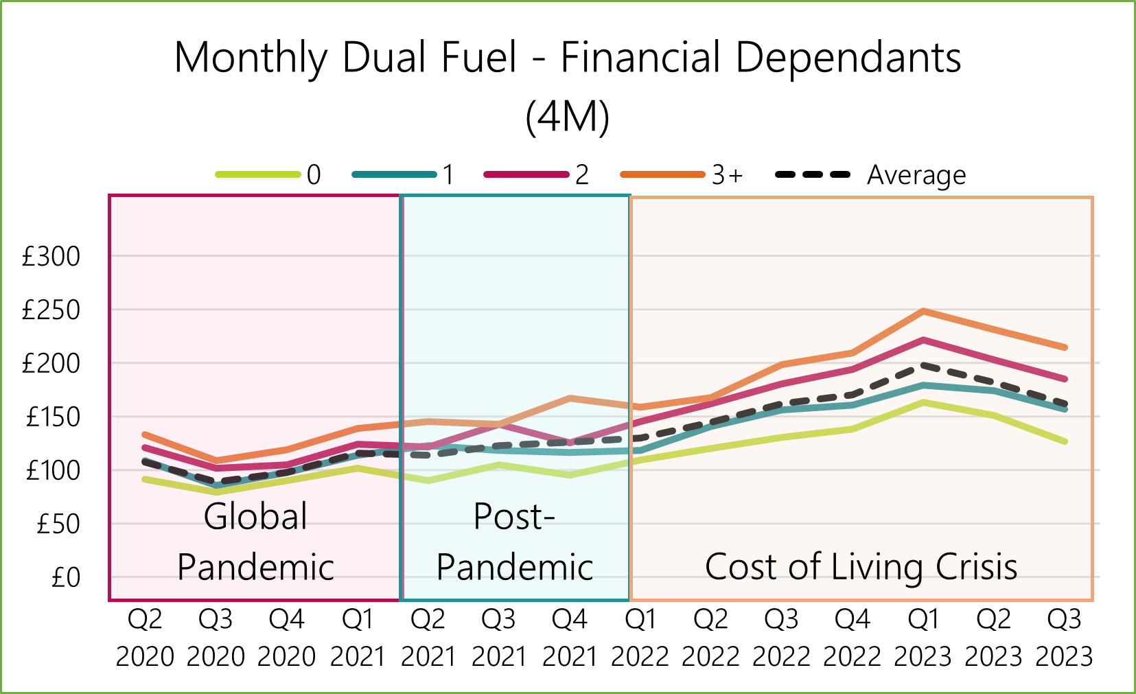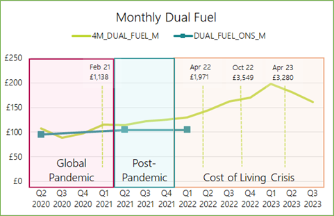Note: Three ONS points used for comparison from the living expenses survey for financial years 2020-2021 and 2021-2022. The survey data covering 2021 – 2022 was released in May 2023. All data included from the ONS table A1 and from 4most from June 2020.