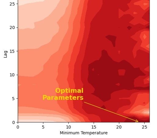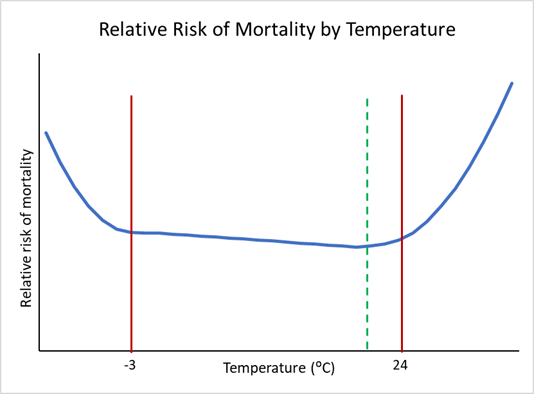 Our findings suggest optimum parameter values: a minimum temperature for hot events of 24˚C with a lag of zero days, and a maximum temperature for cold events of -3˚C with a lag of 10 days (Figure 3). These figures can then be validated by comparing them with findings from scientific research papers. With parameters assigned, we investigated the relationship between temperature and mortality.