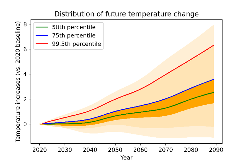 After calibrating, the Monte-Carlo Python model is used to yield the projections seen in Figure 1. The distribution represents temperature increases that are likely to occur during the next 70 years, relative to 2020. They generally show an upward trajectory – although, in extremely optimistic scenarios, the effects of climate change on temperature could be reversed. The array of pathways reflects the uncertainty of climate change effects and the extent to which human action can reduce the impact.