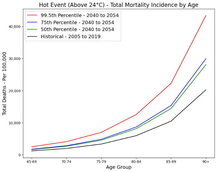 The current analysis is limited by data availability; if we had more data on deaths caused by temperature events, causes of death, and data on actual age rather than age groups, we could create more informative model results. In addition, the current mortality model doesn’t allow for future mortality improvements after 2021, so there will be further considerations about how human physiology and healthcare may adapt to cope with a changing climate.
