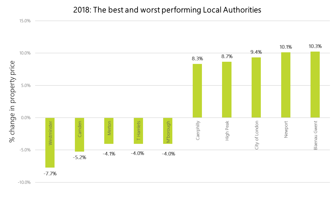 To evaluate how a region is performing, 4most’s AVM looks at all sales in the region. Where a house has been sold twice then the growth in price from one sale to the next can in most cases be attributed to price growth in the region. By aggregating this information, a regional view can be extracted which can be used to create an up to date value of any given house in the region. Evaluating 2018, our model displayed the below best and worst performing Local Authorities that year, proving, as expected, that the removal of the toll on the Severn Bridge has had a positive impact on house prices in South Wales.