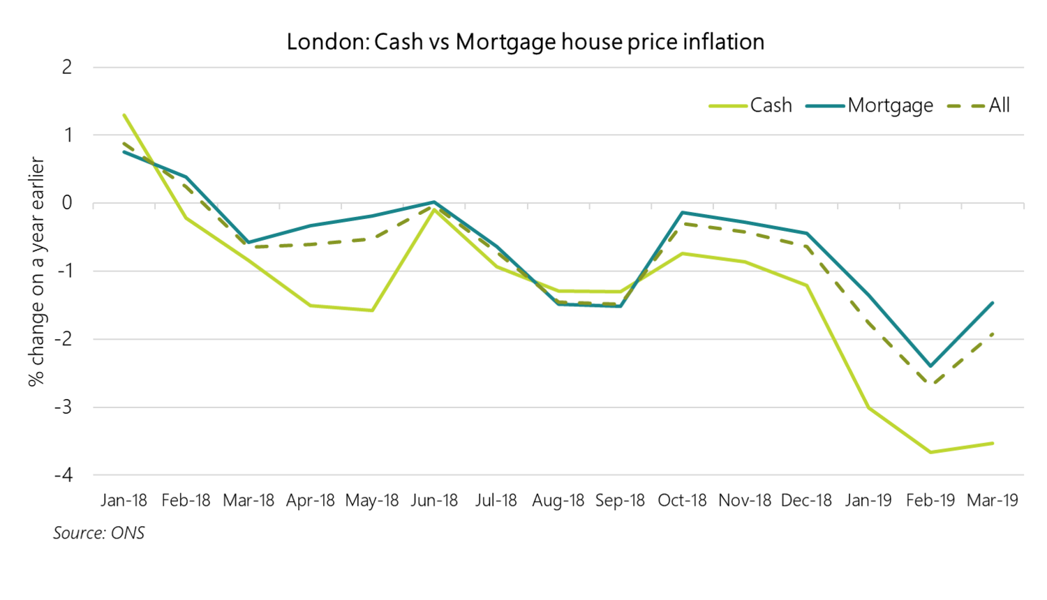 The most accurate view of actual prices paid is obtained from Land Registry records – these form the basis of the ONS UK HPI index and 4most’s AVM and regional forecasts. This has many advantages. For one, it includes cash buyers which has been a growing part of the market in recent years. In London, the prices paid by cash buyers have been falling faster than those using mortgages. This may speak to prices behaving differently in certain market segments, but it emphasises that those wishing to more accurately value mortgage portfolios may want to look at more granular developments in the market.
