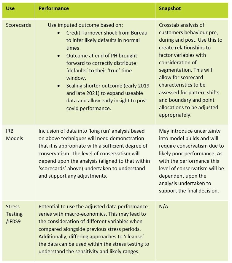 Performance data has been impacted by bank and Government measures e.g. payment holidays and furlough, as outcome states (such as arrears or default, or timing of payments) have been changed. Whilst snapshot data is also impacted by bank and government measures, it also will reflect permanent (or prolonged) shifts such as meaningful changes in expenditure, as there is uncertainty whether these behaviours, that drive creditworthiness and affordability, will return to pre Covid patterns. The degree of impact may be layered by customer, age, health comorbidity factors, employment sector and can be quite nuanced to detect, understand and adjust for.
