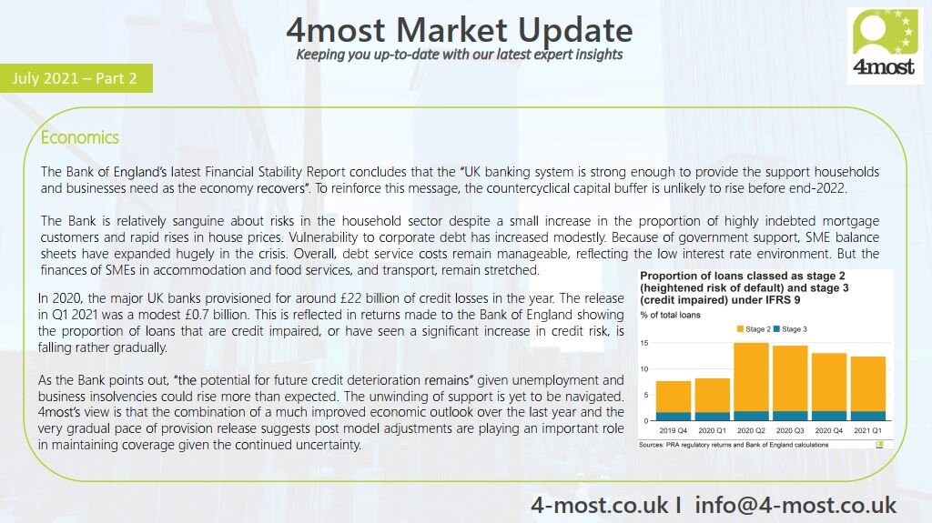 In the 4most Market Update we share our thoughts on the latest changes in the credit risk market. In our second market update for July, we cover the stability of the UK banking sector, credit provision expectations and changes to the mortgage risk floor….click below to view or download.