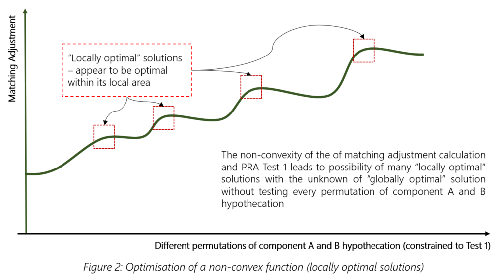 However, when considering maximising the matching adjustment whilst constrained to the PRA tests, optimisation becomes more challenging.