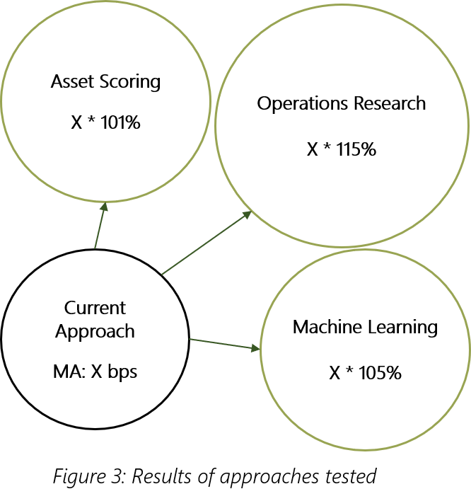 Machine learning algorithms initially proved successful showing significantly more positive results than asset scoring. However, the longer we allowed the machine learning algorithms to run, they did not fully converge. This confirmed the suspicion that machine learning algorithms could not overcome “locally optimal” pitfalls. After allowing the algorithm to run for more than a day, it netted a 5% increase in matching adjustment value.