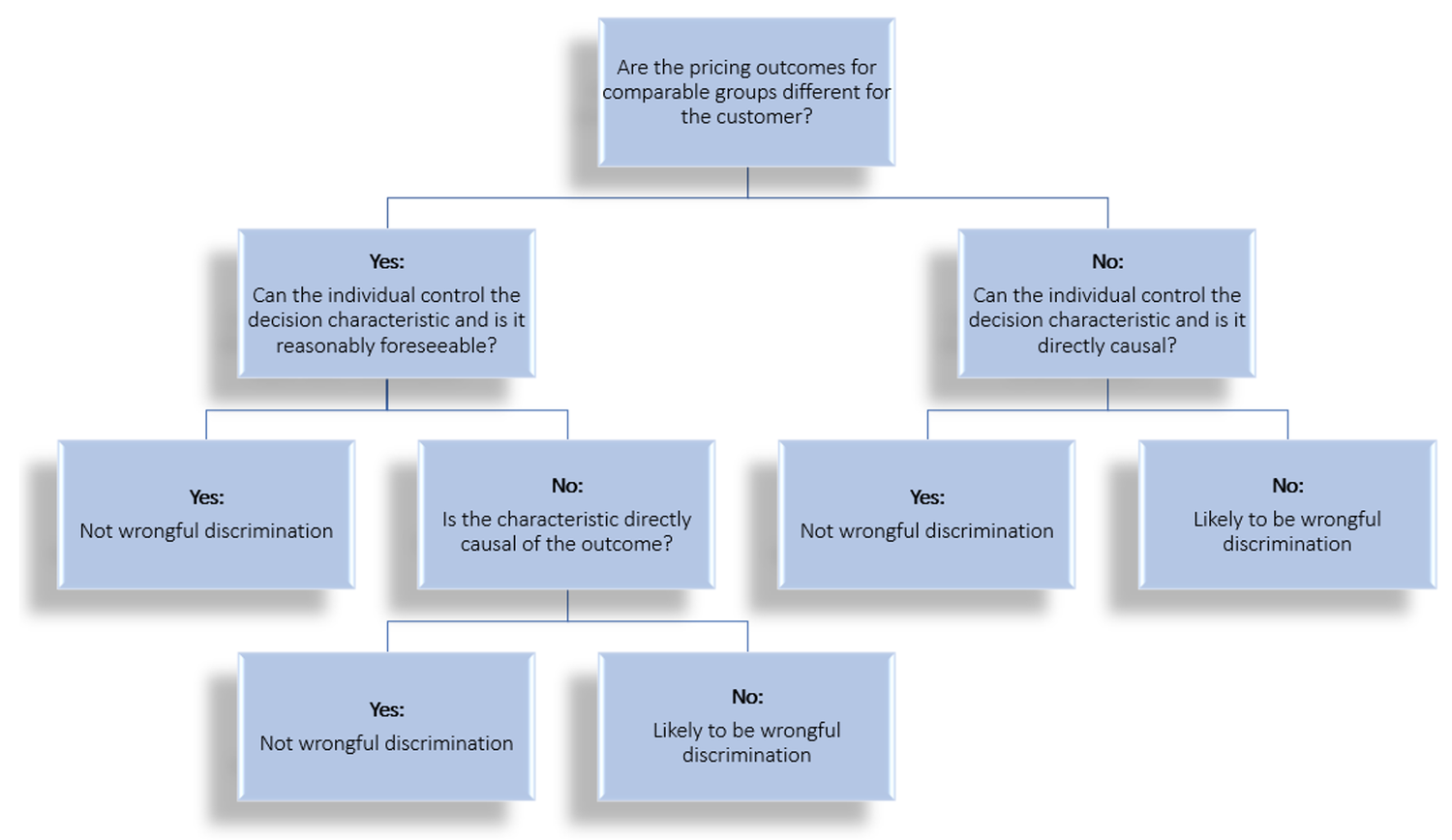 The line between factors 6. and 7. above can be unclear at times. Both factors are driven by price discrimination. The question then becomes which factors, or variables, are fair to use in price discrimination, or when defining granular pricing strategies and models. At 4most we have developed a high-level framework to identify discriminatory decisions: