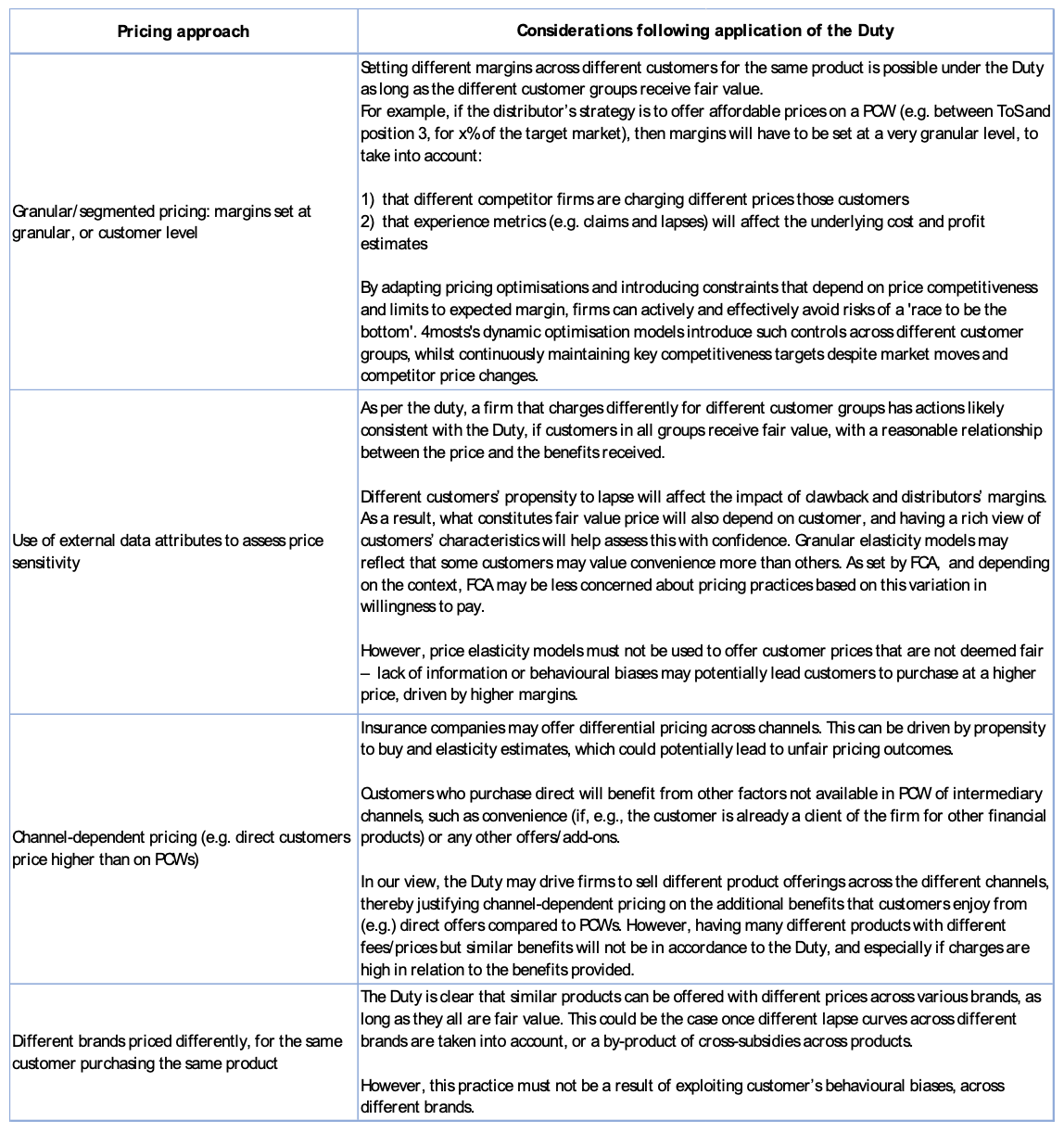 The table below indicates some of the considerations when designing and applying the Duty to the development of sophisticated pricing models and optimisations:
