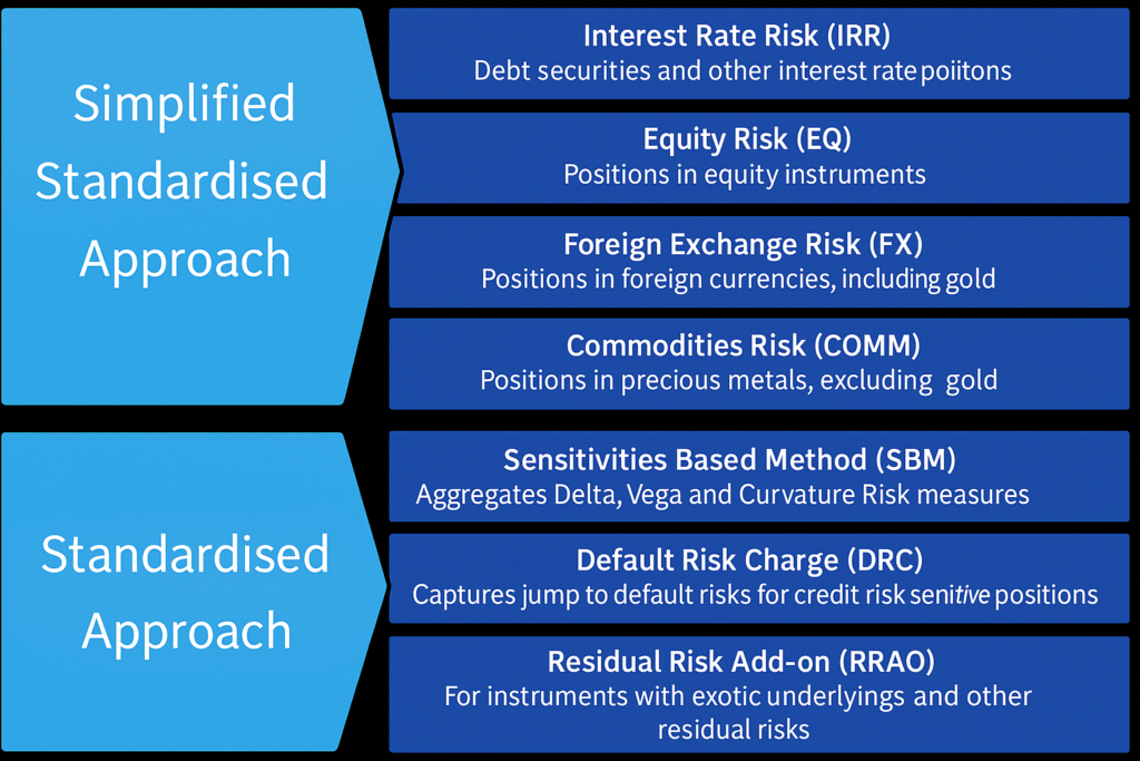 For the SA, the total capital requirement is the sum of the Sensitivities Based Method (SBM), DRC and Residual Risk Add-on (RRAO) components. There is also a Simplified Standardised Approach (SSA) that is less complex and more accessible for banks with small trading books and less sophisticated risk management capabilities.