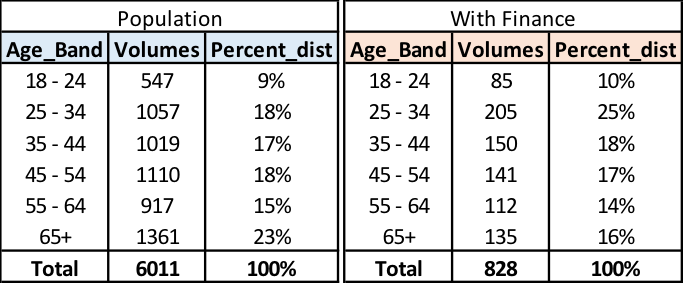 Of the 6,011 households in the sample, some 828 had either a hire purchase or other car finance arrangement. From this, we can make the following conclusions: