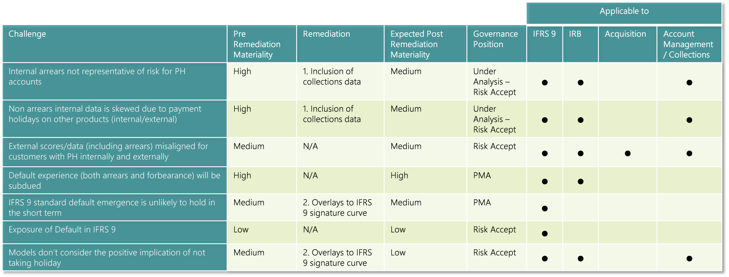 A common theme we are seeing across the industry and a key area of focus for regulators is model risk and institution’s abilities to identify, report and monitor the impacts. The PRA have engaged with organisations to gauge the impact on current models, including questions concerning the current behaviour of IRB/IFRS 9 models. This has focused on identifying specific concerns for particular segments; longer term impacts of models; specific considerations around PD, EAD and LGD; information provided to model governance committees; and direction received and the necessity for recalibrations and/or redevelopments.