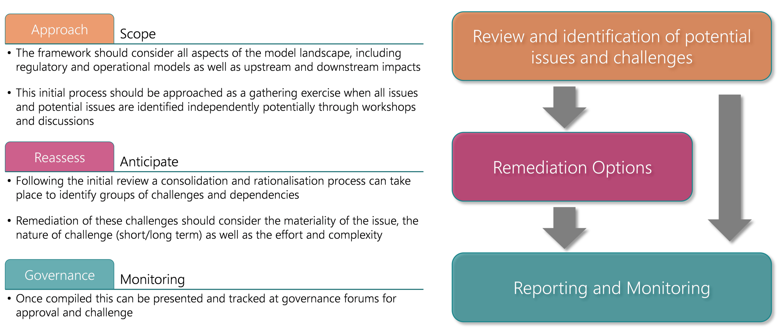 Through a more detailed model risk framework, including identification, reporting and remediation, it is possible to gain a holistic view of the challenges being faced and the optimal way to address them. The below schematic gives a simple overview of the approach to identify and address model performance risk issues in the most efficient manner.