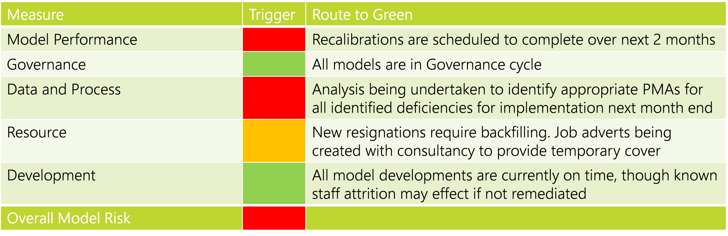 An evolved view of model risk allows the creation of dashboards presented throughout the governance process, including the Board Risk Committee, to provide a greater understanding of all risks to models and their uses. Therefore, as part of developing an enhanced model risk framework, consideration should be given to wider measures including but not limited to data, resource capacity, process efficiency and governance controls. Through having a wider view of the model risk landscape, it is possible to identify unseen elements of model performance and also detect early warning indicators, for example, long term low resource levels are likely to cause impacts to maintenance and governance controls in the future.