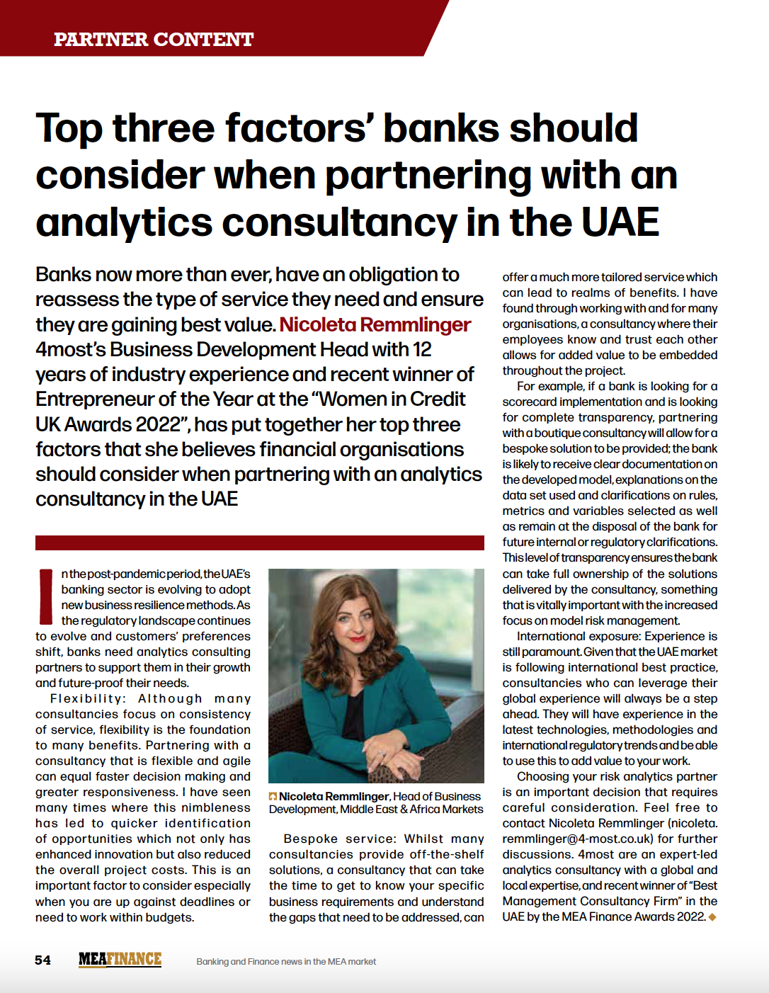 Banks now more than ever, have an obligation to reassess the type of service they need and ensure they are gaining best value. Nicoleta Remmlinger, 4most’s Business Development Head, with 12 years of industry experience and recent winner of Entrepreneur of the Year at the “Women in Credit UK Awards 2022”, has put together her top three factors that she believes financial organisations should consider when partnering with an analytics consultancy in the UAE.